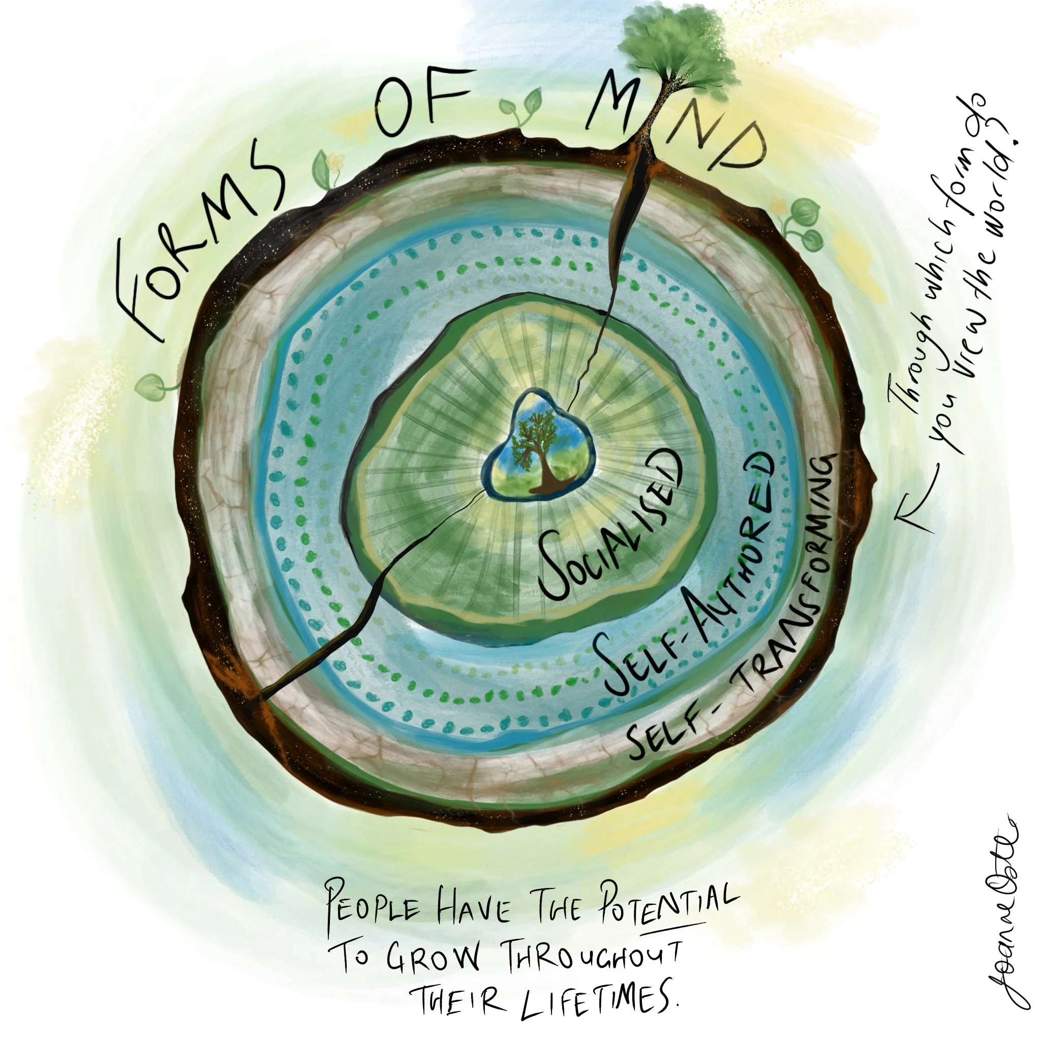 Like a tree, we always carry the earlier rings of our development, and these foundations are essential to standing strong. As adults, it can be helpful to consciously step back into these earlier “rings” to view the world from a different perspective. For example, when navigating a difficult situation with someone who seems to see the world very differently—perhaps they are focused on the “right” way or are aligned with power dynamics—this perspective can help us understand their limitations and growth edges.